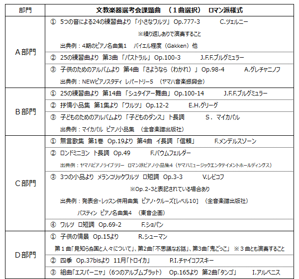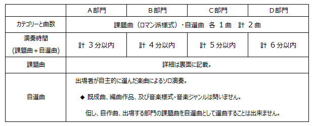 - 制限時間は、最初の楽曲を弾き始めから、最後の楽曲の弾き終わりまでとします。 ※曲間は含み、入退場時間及び補助ペダルや足台等の設置・撤去の時間は含みません。